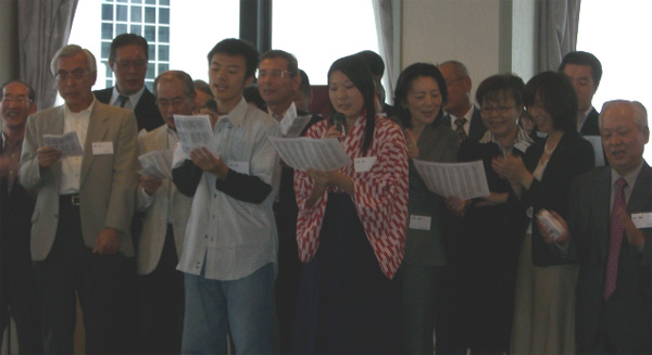 | 校友歌「味酒ヶ原」の斉唱では、新旧大いに入り混じり、盛り上がりました。 |