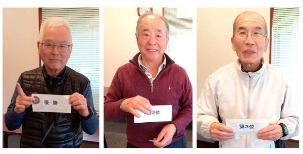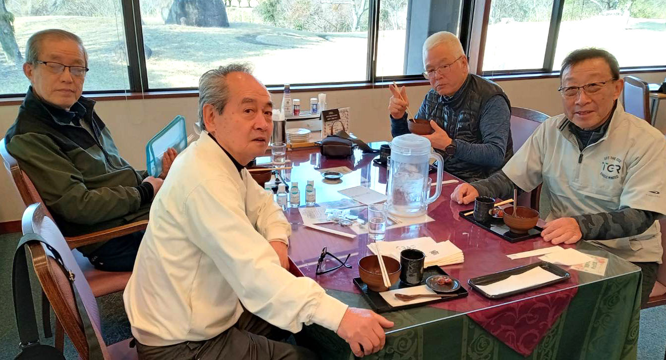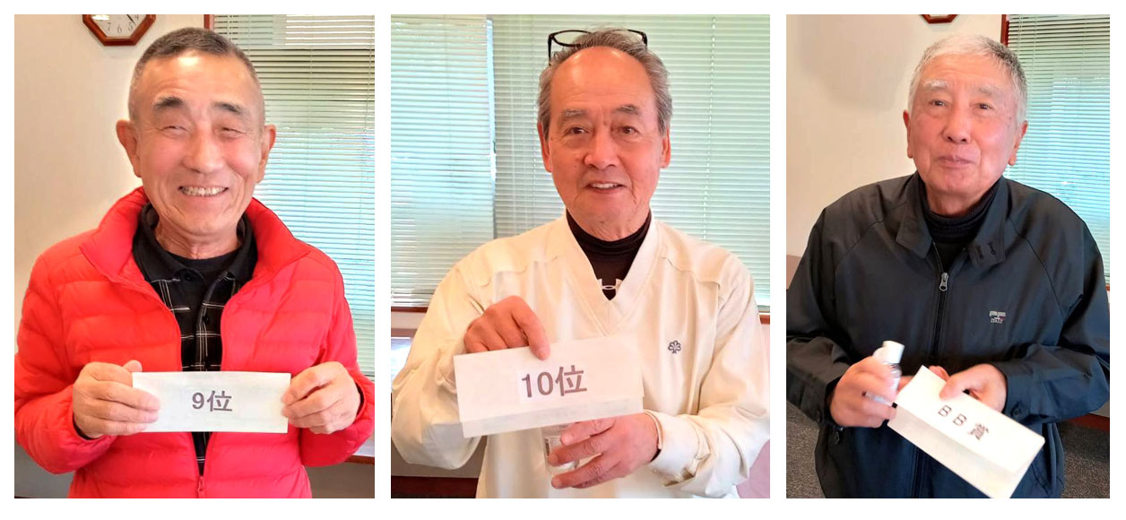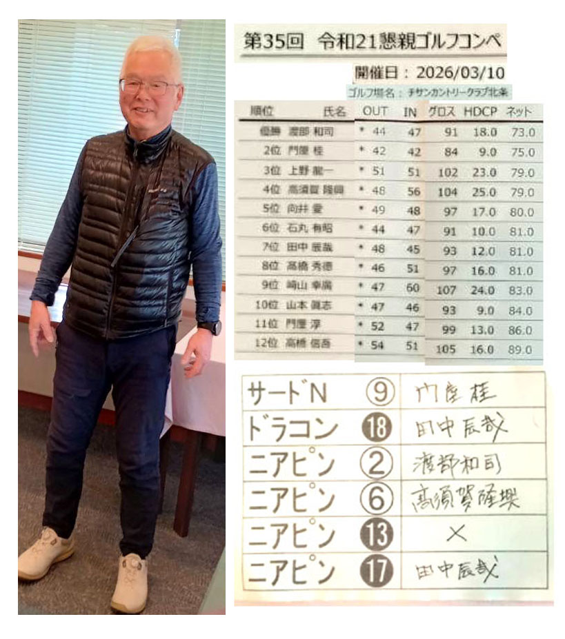 「寒の戻り」か冷え込みの厳しい中でのラウンド、速いグリーンに翻弄されながらも前回の無念晴らした渡部和司さんが優勝!!実力者でベスグロの門屋桂さんが準優勝!!おめでとうございました!!ぜんざいを頂きながら和気あいあいの表彰式となりました!いつも楽しい同級生ゴルフ。次回は5月12日㈫また元気に集りましょう (高橋秀徳) ピンボケになったお二方写真がありません。すみません。 (高橋秀徳) 有り難うございます! (木本健郎) 寒風のなかアウト上がりホール5連続パーの崎山くん。昼食時にエネルギーチャージが足りず後半息切れしましたが、ナイスプレイですね〜。今回も楽しく過ごさせていただきました。ありがとうございました(ありがとう) (上野龍一) 本日はお疲れ様でした。 超ロングパットをねじ込みガッツポーズの人、5パットで呆然の人と色々有りの1日でした。 こんな面白い時間に感謝です。 優勝の渡部和司氏、準優勝の門屋桂氏おめでとうございます。 次回5月から新HDになり益々楽しいゴルフになりそうです。これからも元気なゴルフ続けて行きましょう。 (yusho) 幹事に感謝です。お疲れ様でした。来年度も宜しくお願いします。 (淳)