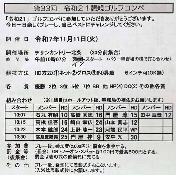 昨日はお疲れ様でした。大変有意義で楽しい時間と共に、優勝までさせていただきました。ありがとうございました。 次回は発足から7年目の最初のゴルフです。年間成績での新ハンディとなります。 (全員優勝チャンス) それまで年齢に抗い、シッカリ練習して同級生ゴルフを元気にやりましょう。 案内は来月始めにします。よろしくー(yusho)