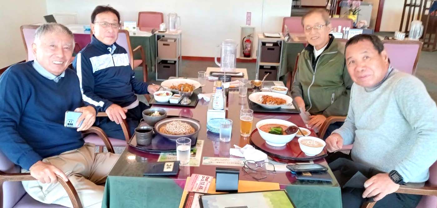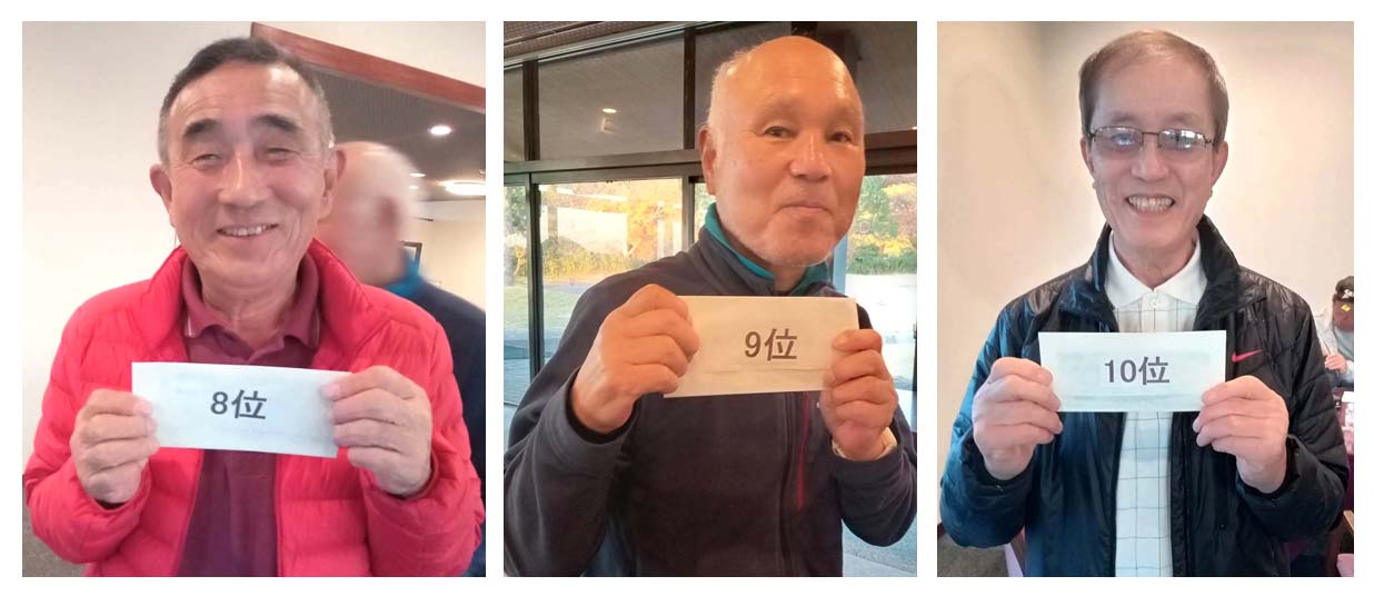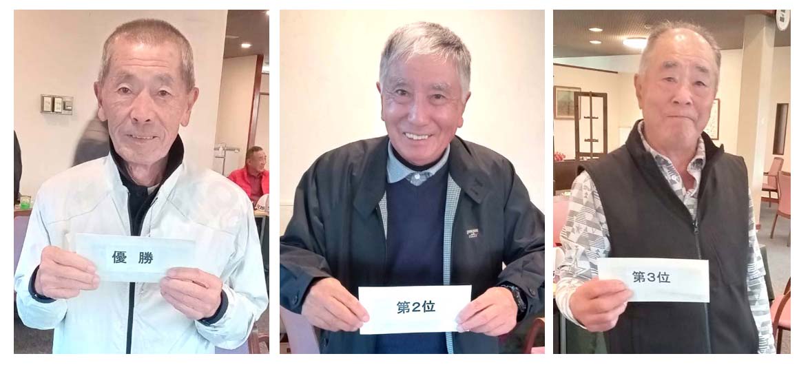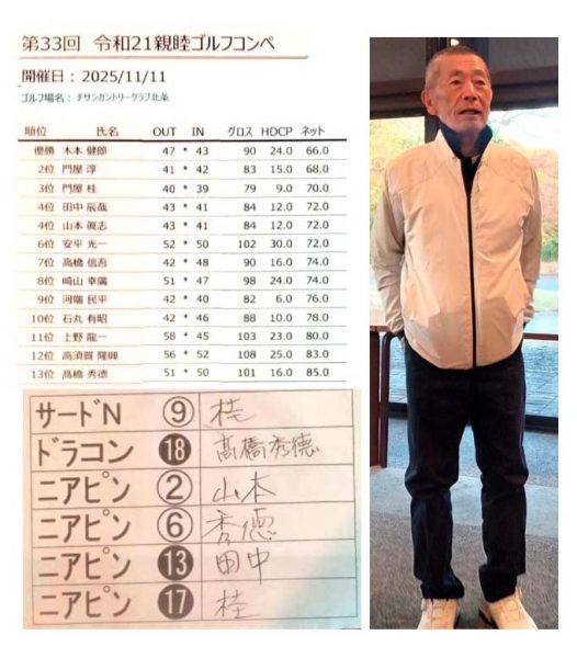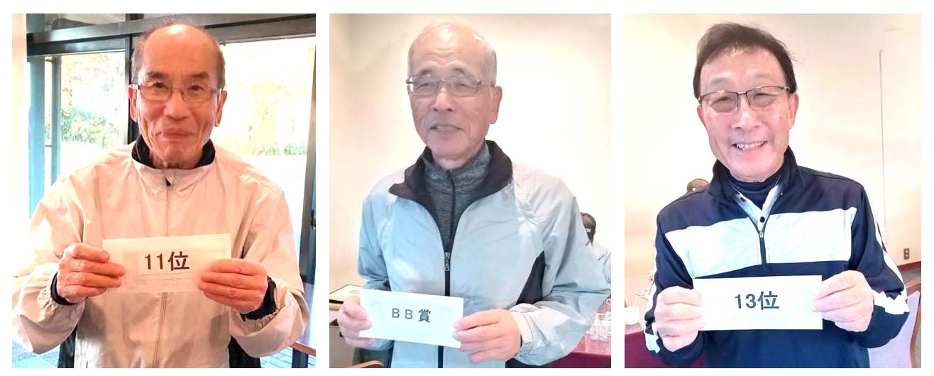夕闇迫る頃迄のゴルフお疲れ様でした。 木本健郎さん、堅実なプレイでの優勝おめでとうございます! いつも楽しい同級生ゴルフ、今年一年有難うございました。 次回は令和8年1月13日㈫です! 来年も元気に集まりましょう! (高橋秀徳) 木本君のアプローチショット、民平のリカバリーショットや信吾ちゃんのニューイングのボールの話など楽しさ一杯の一日でした。懲りずに練習しますので、今後ともよろしく。 (上野龍一) 日暮れまで、大変お疲れ様でした。今日も打ち方忘れたのか?と思わせる面白いゴルフの一日でした。 木本さん、優勝おめでとうございます。日々の努力の賜物ですね。 今回も目標の元気に楽しいゴルフはやれたと思います。 次回も多くの参加を期待してま〜す。 (yusho) 幹事お疲れ様でした。次回も宜しくお願いします。 (淳) いつもみんなの元気な笑顔に会えます。次回7位の皮を返却します。よいお年を。(高橋信吾)